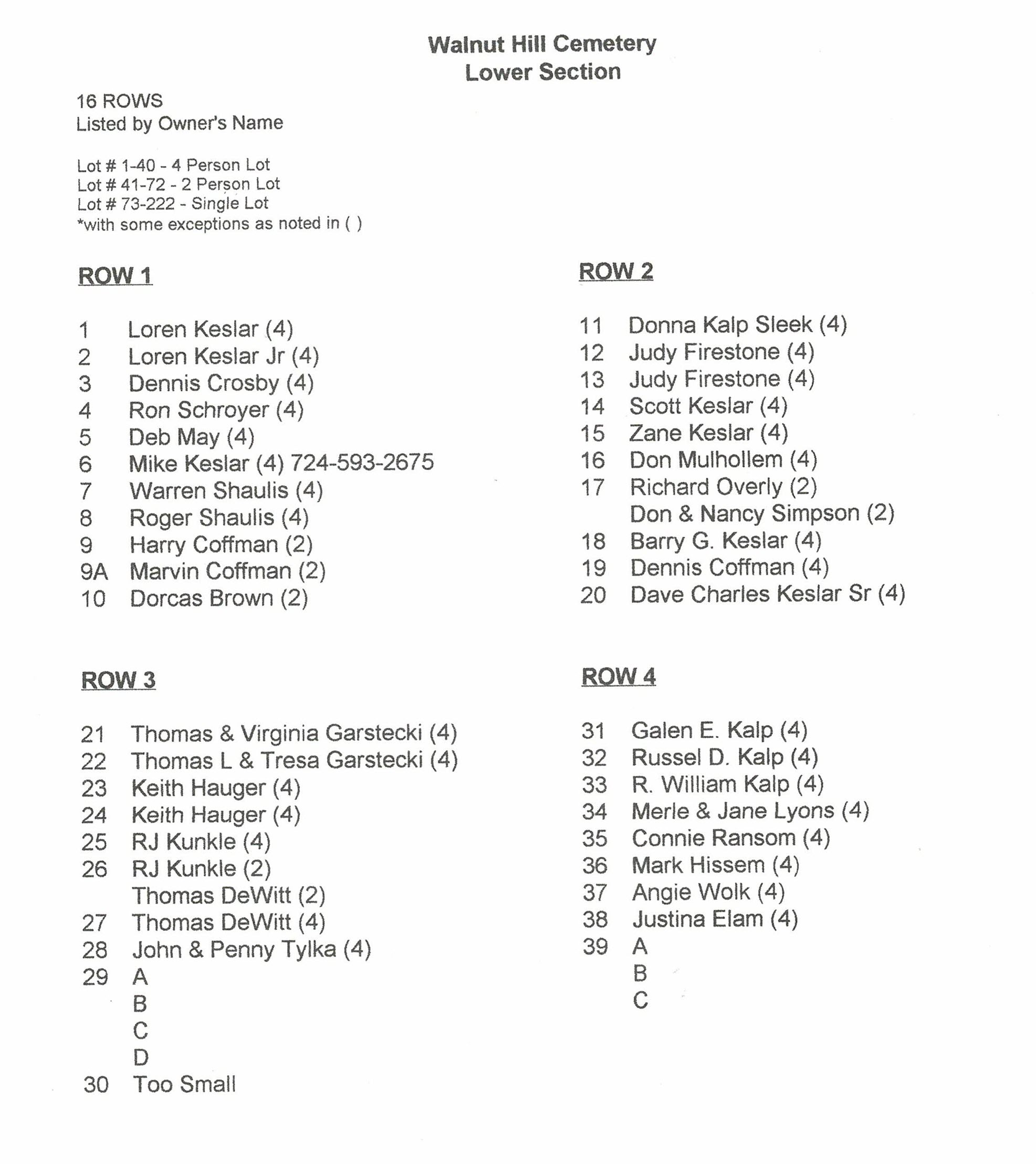 Donations are appreciated to help pay for the maintenance of our Cemetery: Please make checks Payable to "Walnut Hill Cemetery" and mail to: C/O Jeannine Brown, 1229 Route 711, Stahlstown, PA 15687